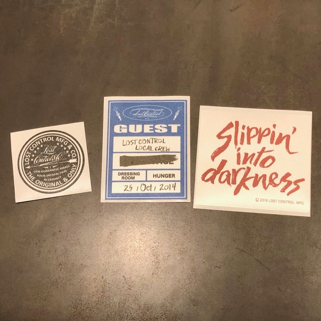 No. L19S1-8043 QUALITY : ACETATE ETC サテンステーカーセット 実際のゲストパスと同様の素材で製作したユニークな仕上がり 布にも貼ることができるので通常のステッカーとは違った楽しみ方が出来る。 "Guest Pass" "Slippin'into darkness" "Emblem"の3枚セット "Guest Pass" 73mm×93mm "Slippin'into darkness" 98mm×88mm "Emblem" 直径59mm ※ご利用のモニター等により実際のお色と差異がある場合がございます。 ※個体差による寸法の誤差がある場合がございます。 LOST CONTROL ロストコントロール正規店・通販 | CROSS ROAD BLUES https://cross-road-blues.com 〒745-0031 山口県周南市銀南街57番地 けやき通り1階 TEL : 0834-22-6149 MAIL : [email protected]