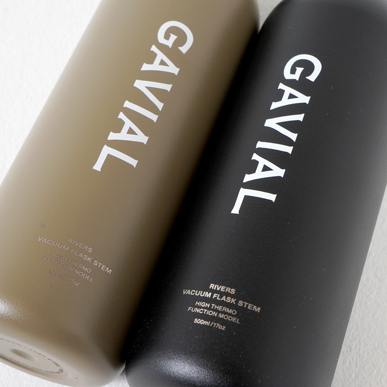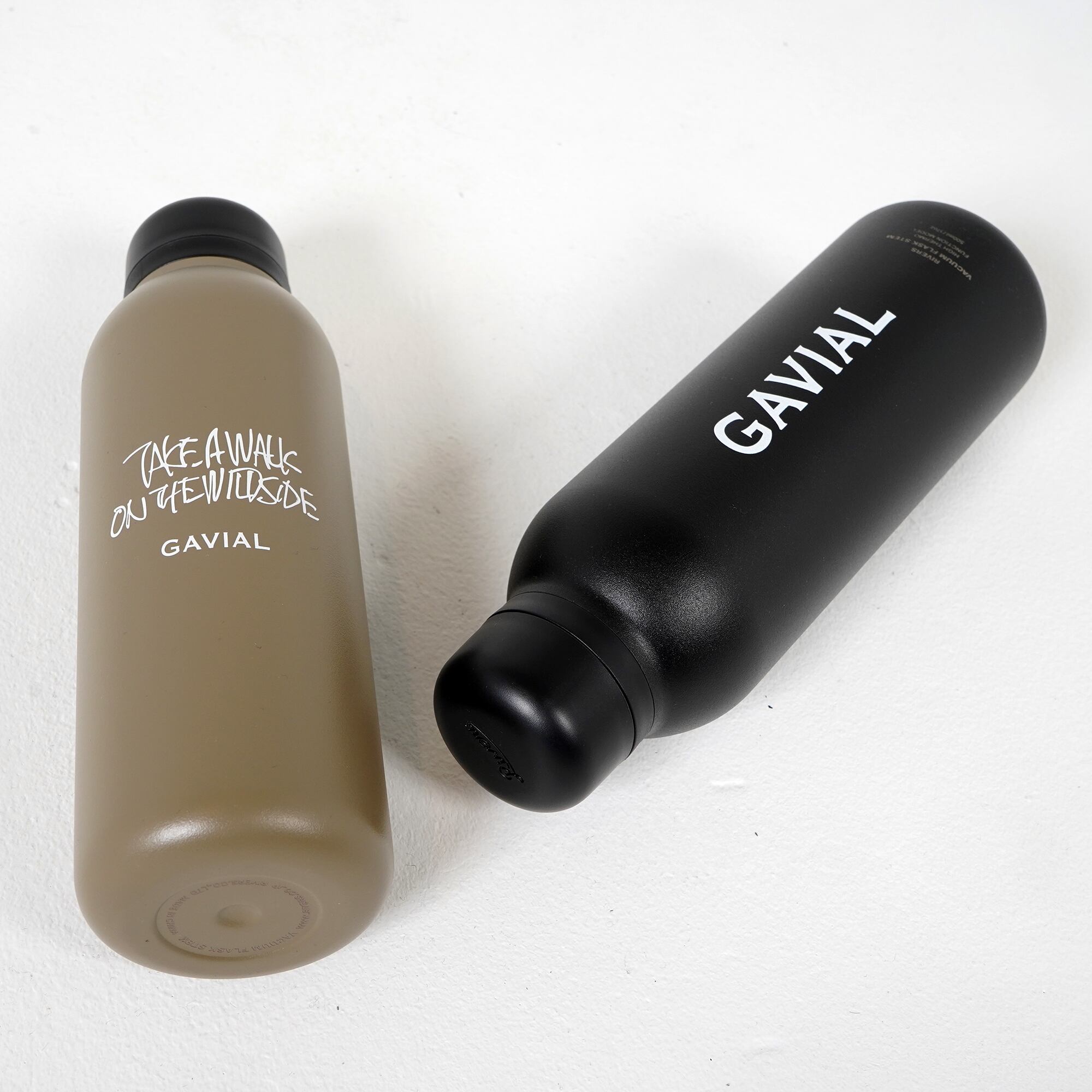 「ドリンクウェア」にフォー カスしたプロダクトを展開するリバーズ の ハイスペックかつミニマル デザインの軽量ステン レスボトルを使用し、GAVIALロゴと手描きの スローガン文字をプリン としたステンレスボトル。
