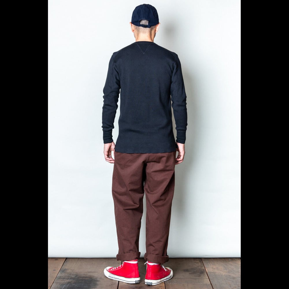 フラットシーマ (4本針) による縫製を中心に仕上げたサーマルカットソー。